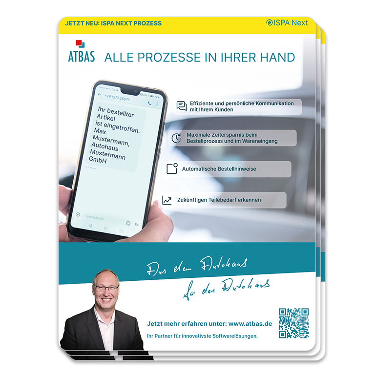 ATBAS bietet auf ISPA Next ausgerichtete praxisnahe Lösungen über die im Weiteren aufgeführten Herausforderungen hinaus. Durch die Neuentwicklung in Bezug auf ISPA Next bietet Ihnen ATBAS NET die Möglichkeit, den gesamten Teilevertriebsprozess optimal zu steuern.