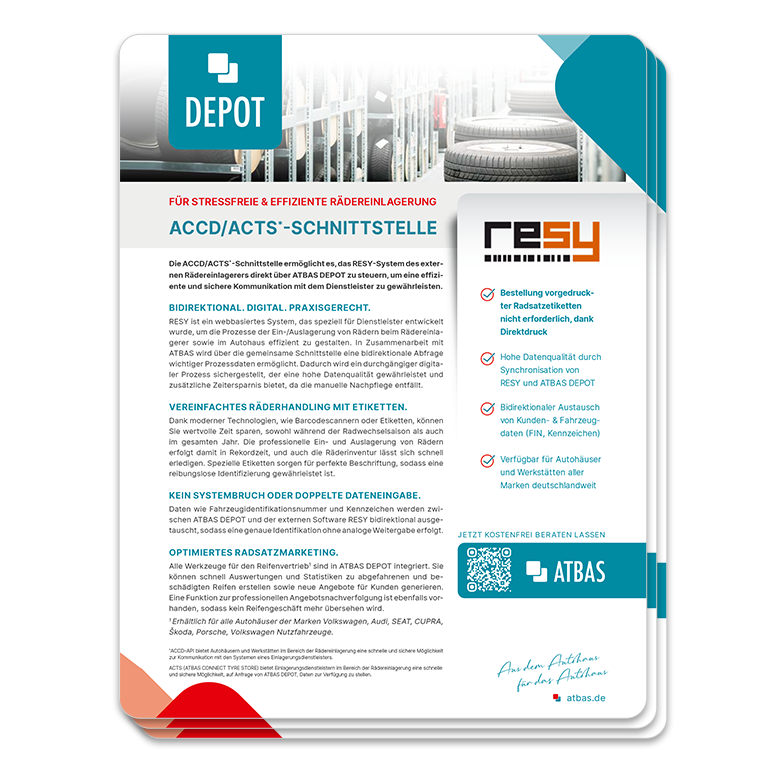 Datenschutzrelevante Kunden- und Fahrzeugdaten, wie u.a. die Fahrzeugidentifikationsnummer und das Kennzeichen, werden bidirektional zwischen ATBAS DEPOT und der externen Software RESY ausgetauscht. Eine analoge Weitergabe dieser Daten ist nicht mehr erforderlich. Durch diese Maßnahmen wird eine exakte Identifikation ermöglicht.